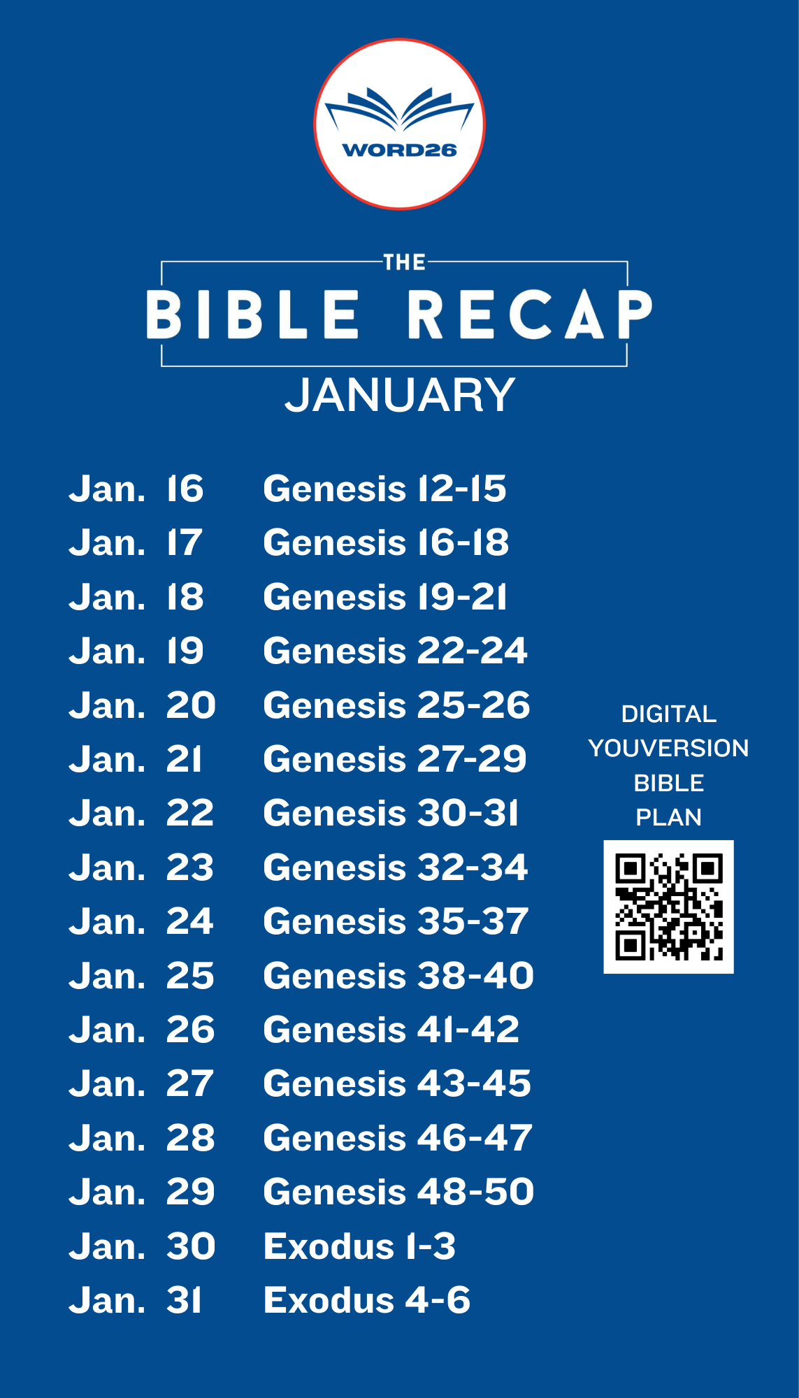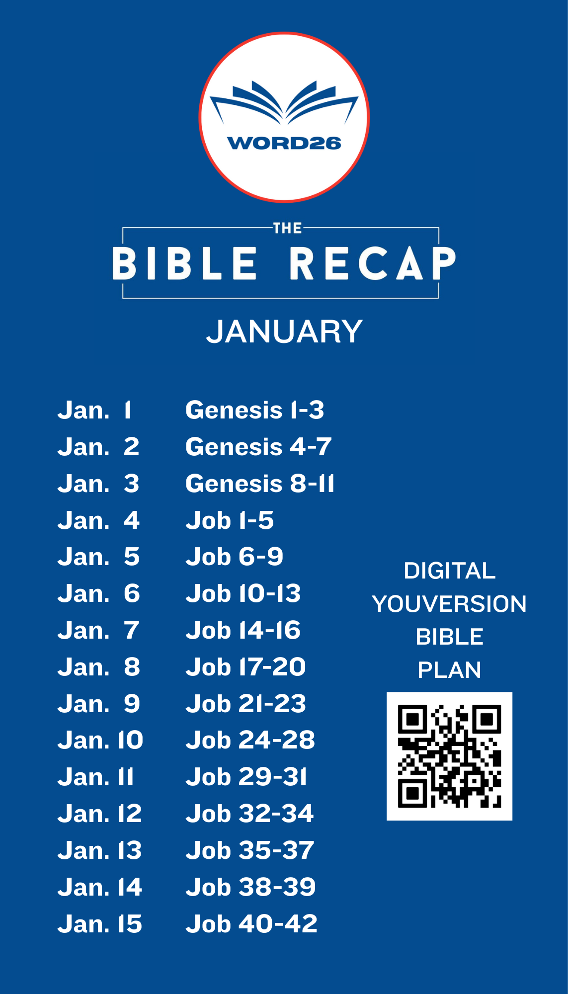 This is a Chronological Bible Reading Plan put together by Pastor Jon Thomas. Throughout 2026, we will read the Bible together as a congregation and the Sunday sermons will relate to the weekly reading. We will follow the YouVersion Bible Recap plan throughout the Old Testament and our own YouVersion plan for the New Testament.